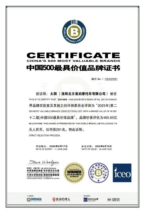 • Dayang Brand: Ranked among China's Top 10 motorcycle brands, it has a brand value of 46.565 billion yuan (ranking 261st in the 2025 China's 500 Most Valuable Brands list). It is one of only two motorcycle brands on the list and has successively obtained titles including China Well - Known Trademark and National Key Protected Trademark.